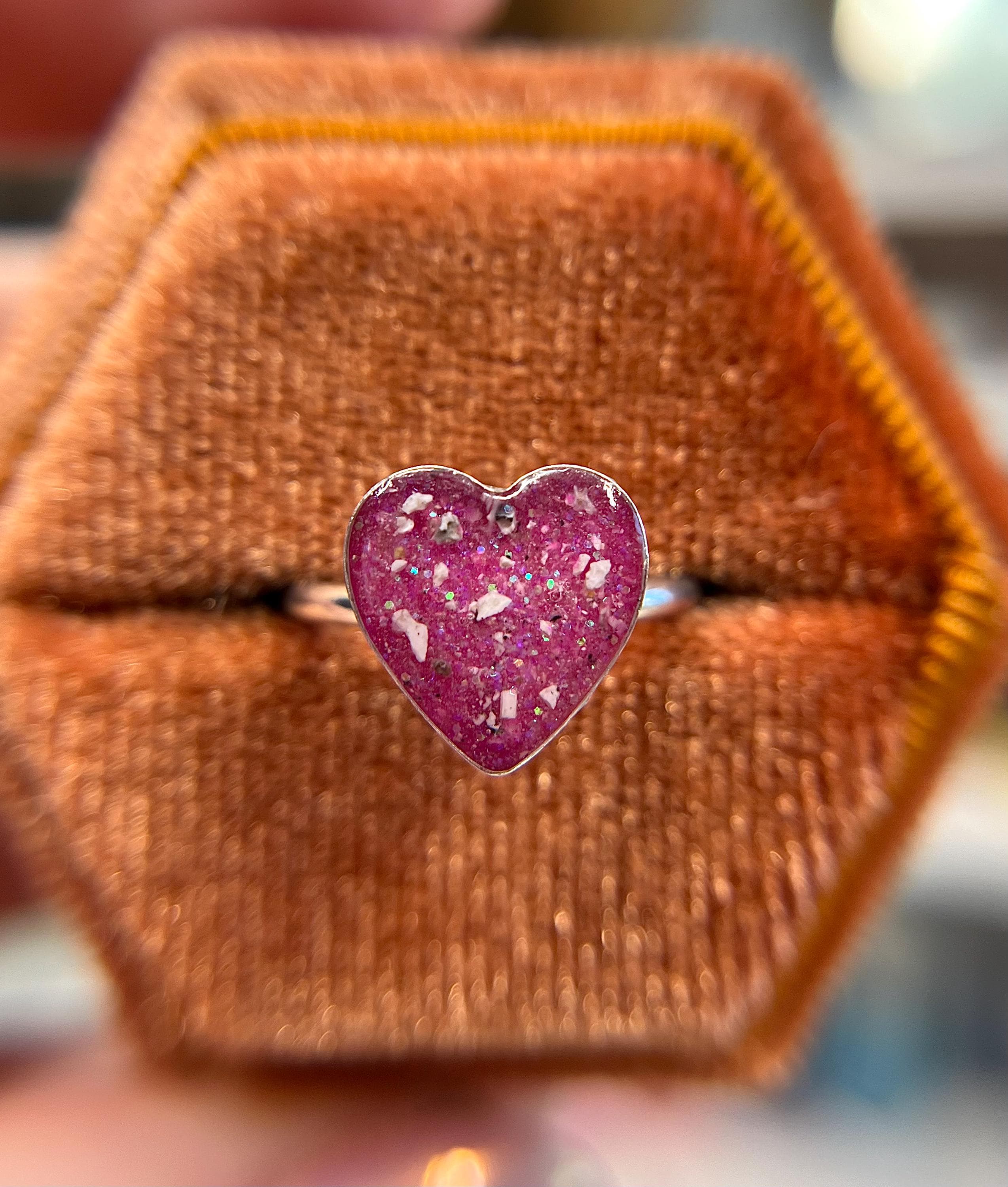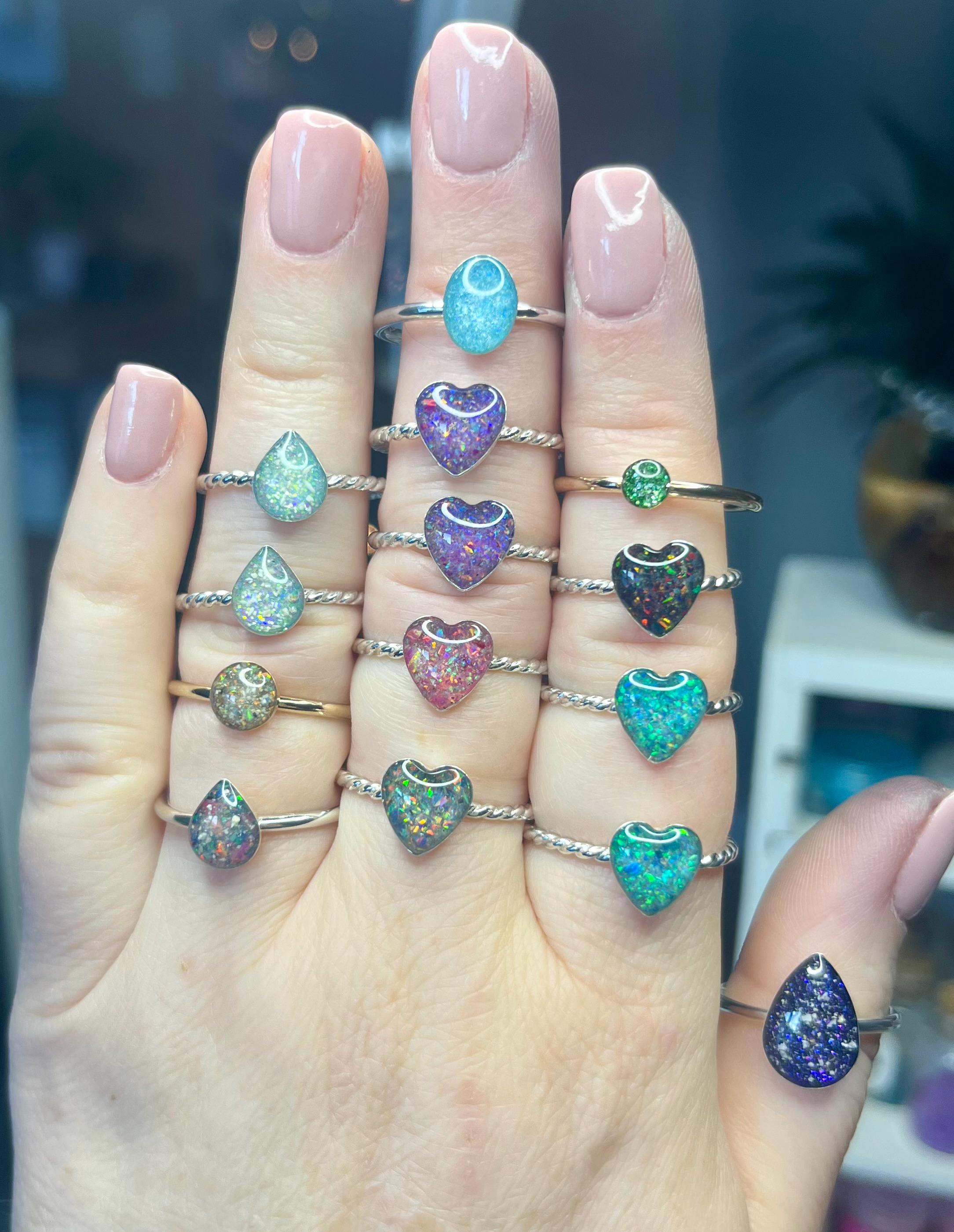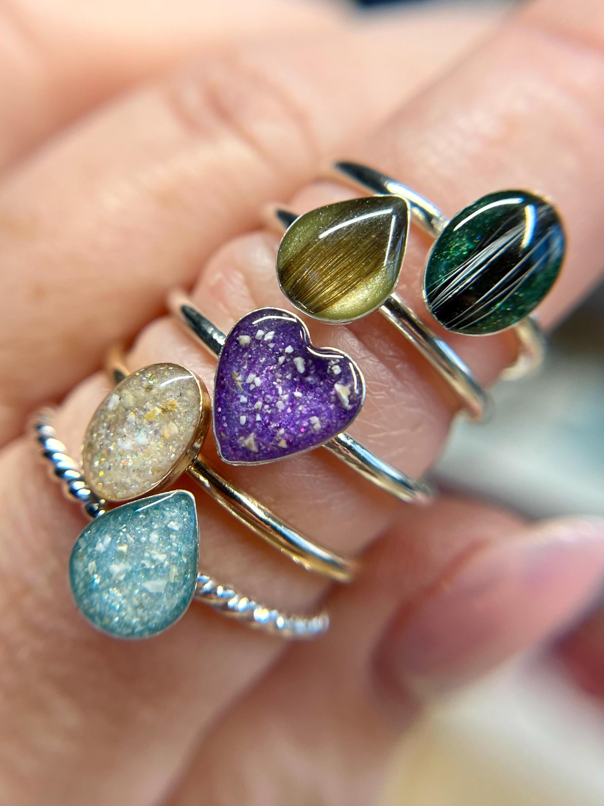 This handmade memorial ring is created using your pets ashes, fur, whiskers or other inclusions. Each piece is thoughtfully crafted with care, shaped slowly and intentionally, and made to be completely one of a kind. No two rings are ever the same — each one reflects the unique story and connection it’s meant to honor.
