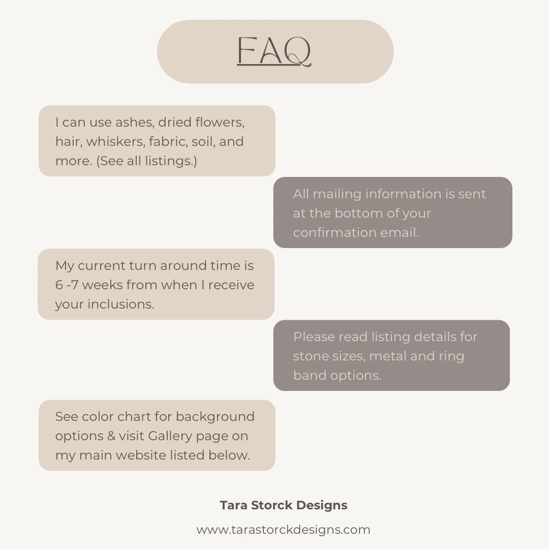 For cremation pieces, I only need ¼–½ teaspoon, which is enough for several pieces. I can create keepsakes using ashes, hair, fur, whiskers, dried flowers, fabric, soil, pregnancy caps, and more. Please see my other listings.