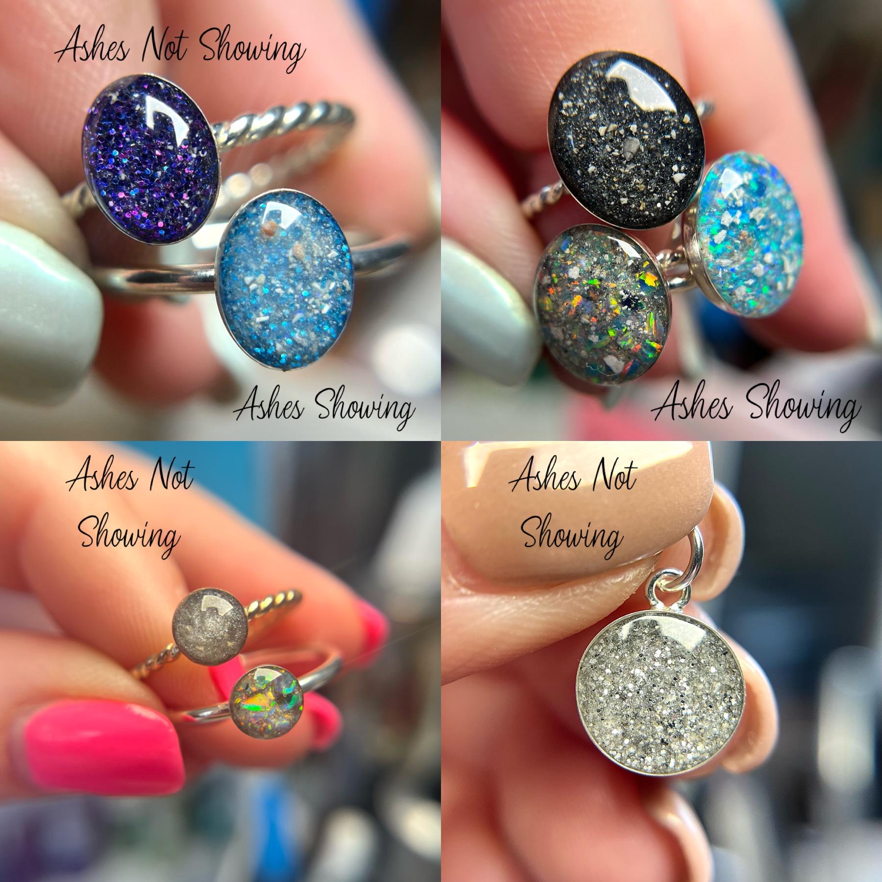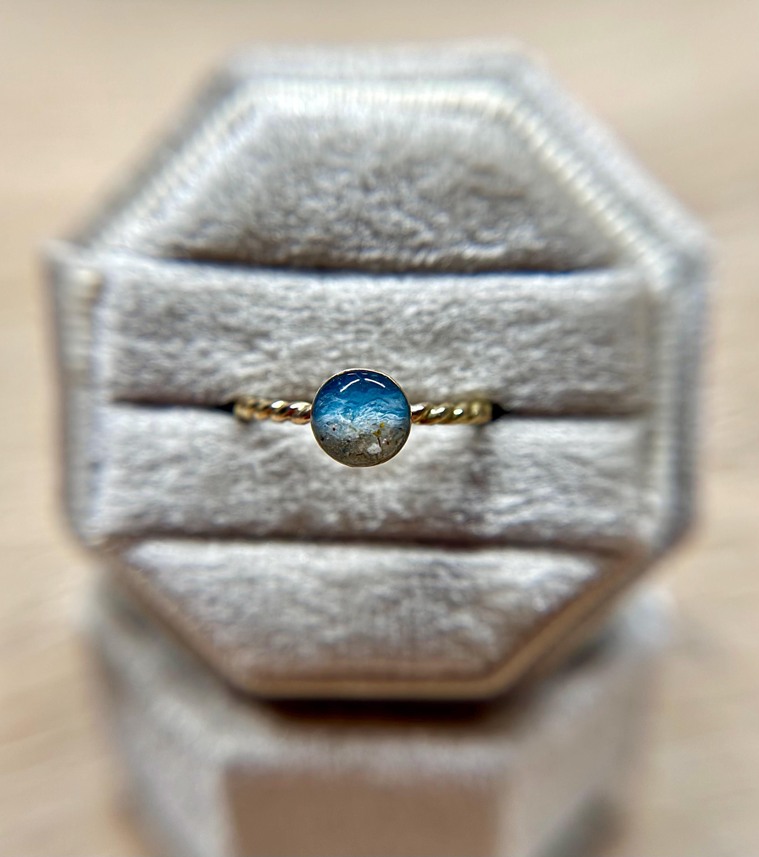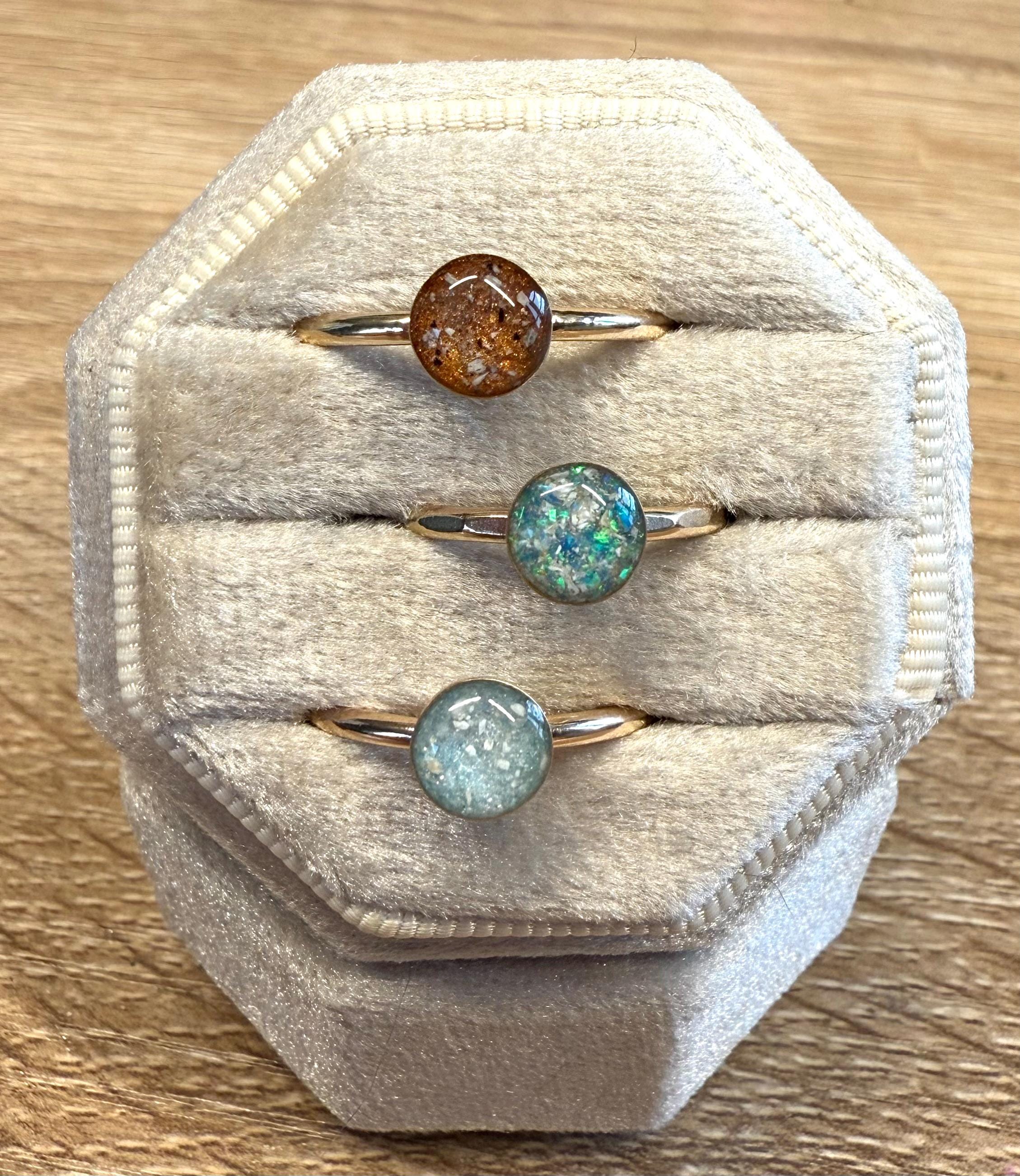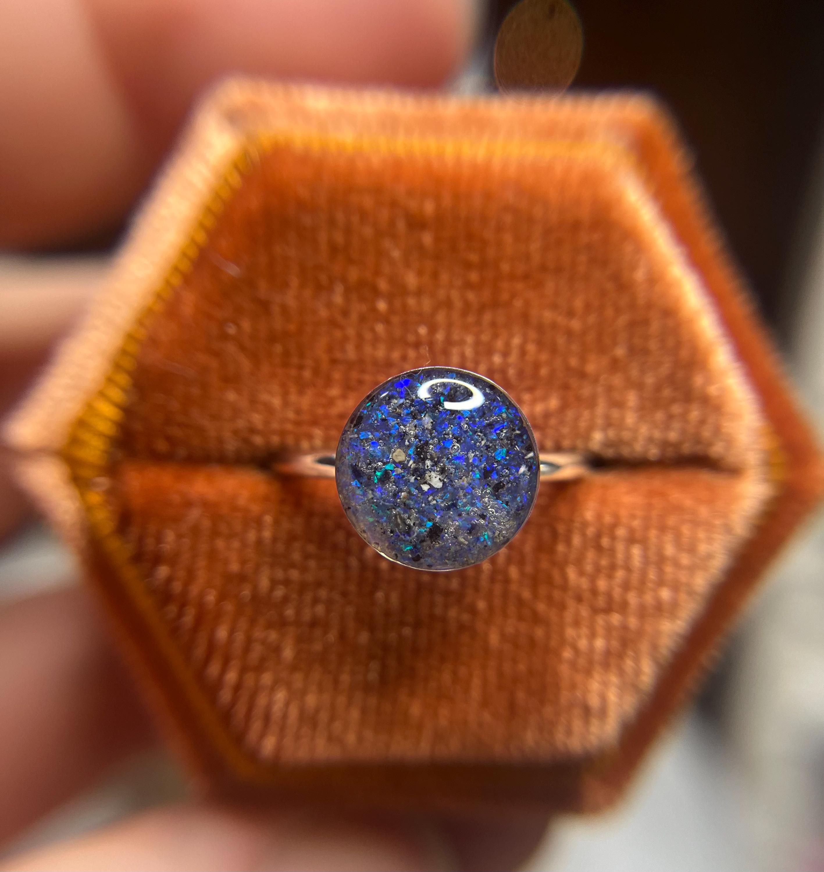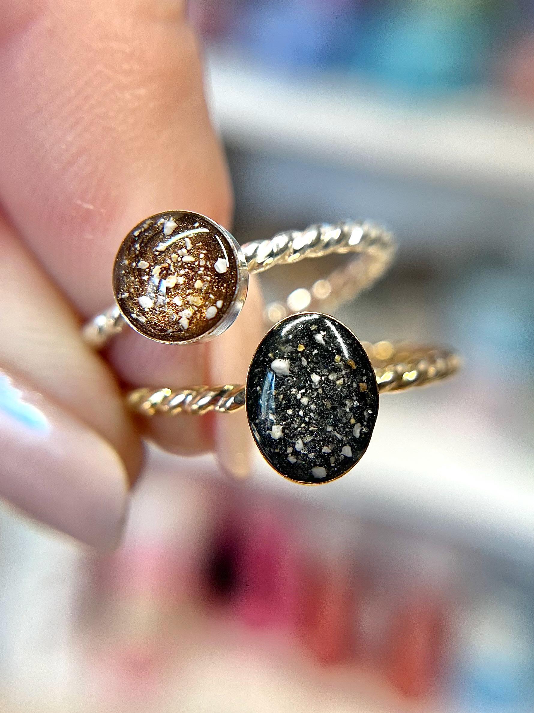 This handmade memorial ring is created using your pets ashes, fur, whiskers or other inclusions. Each piece is thoughtfully crafted with care, shaped slowly and intentionally, and made to be completely one of a kind. No two rings are ever the same — each one reflects the unique story and connection it’s meant to honor.