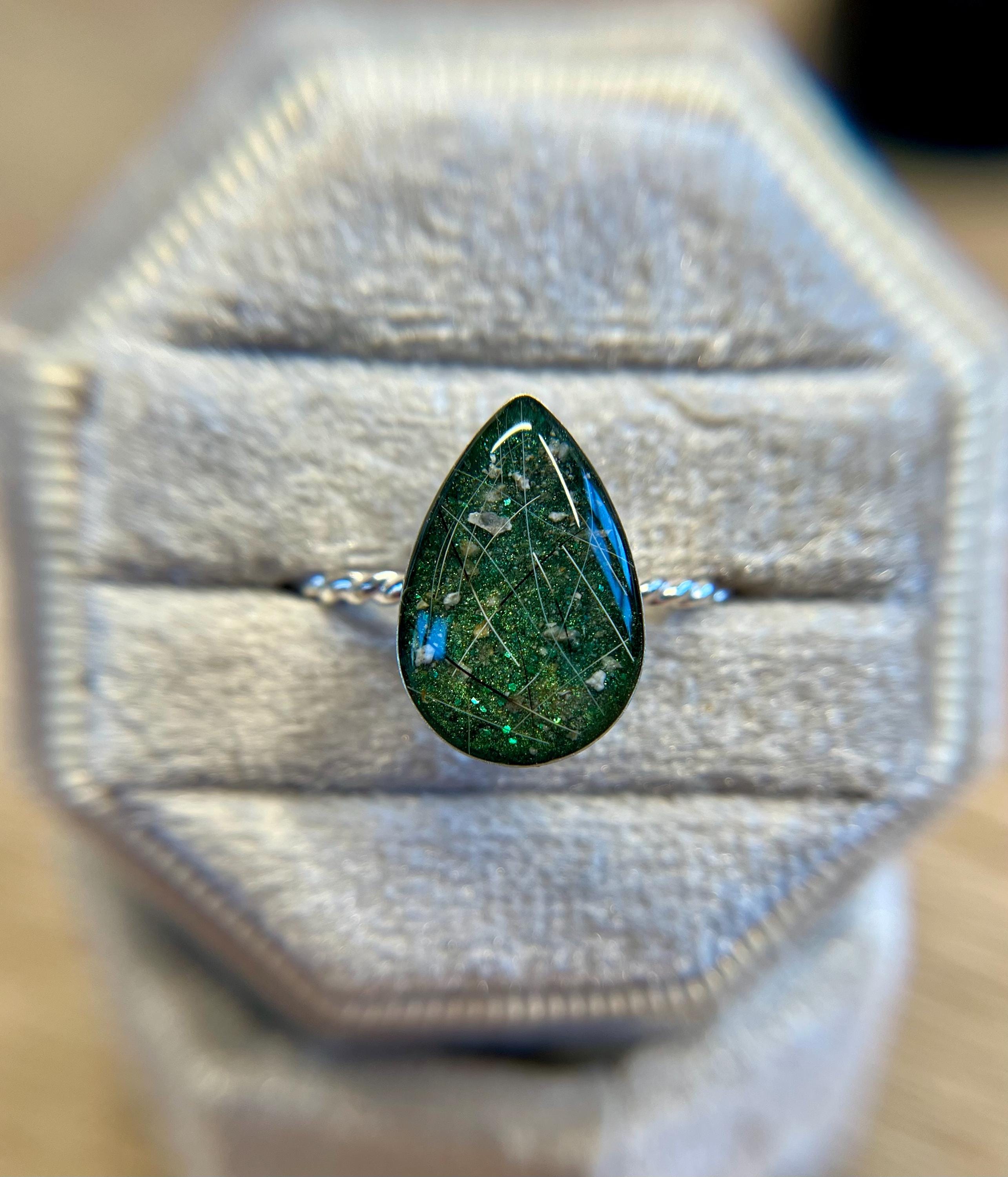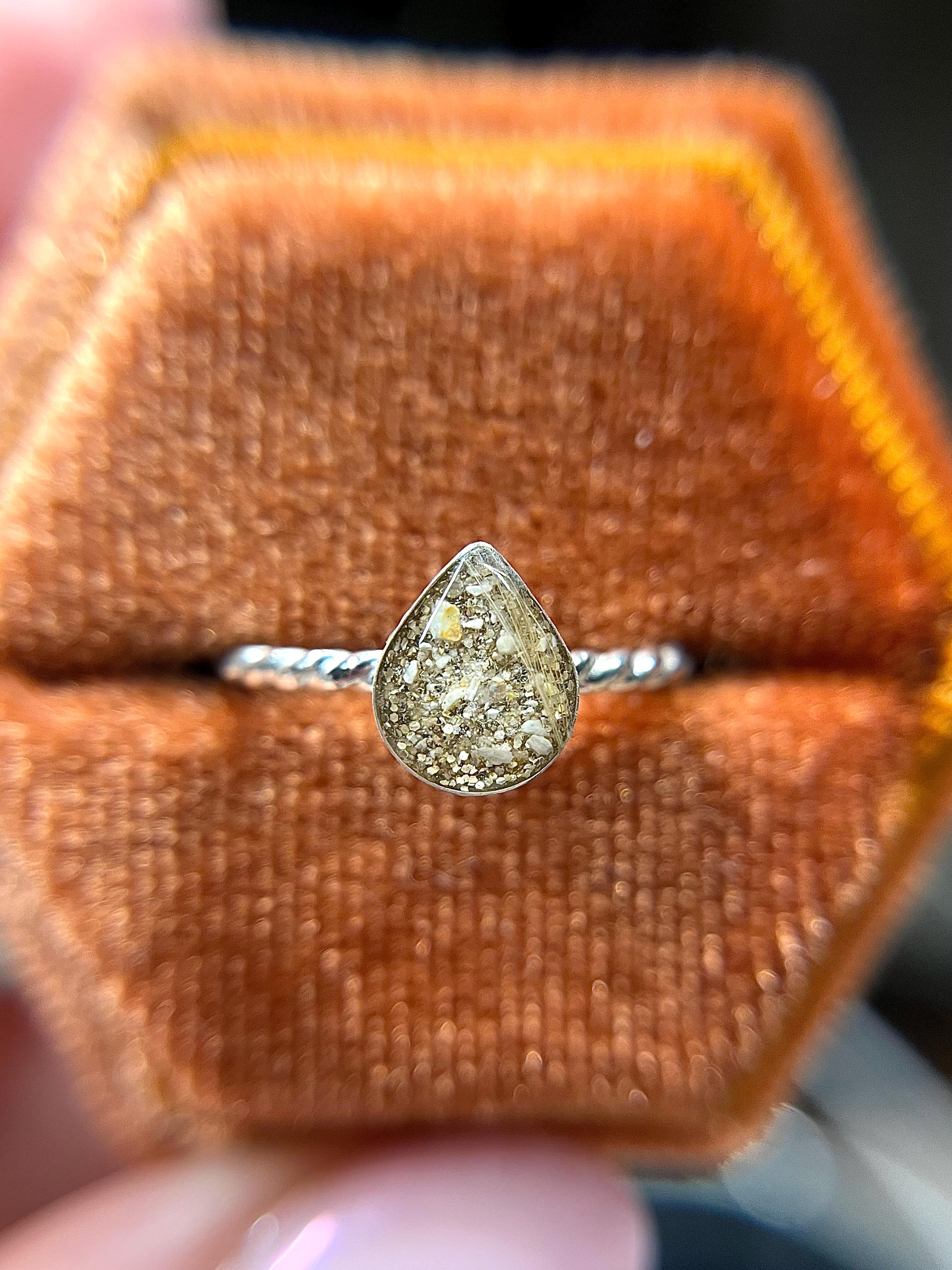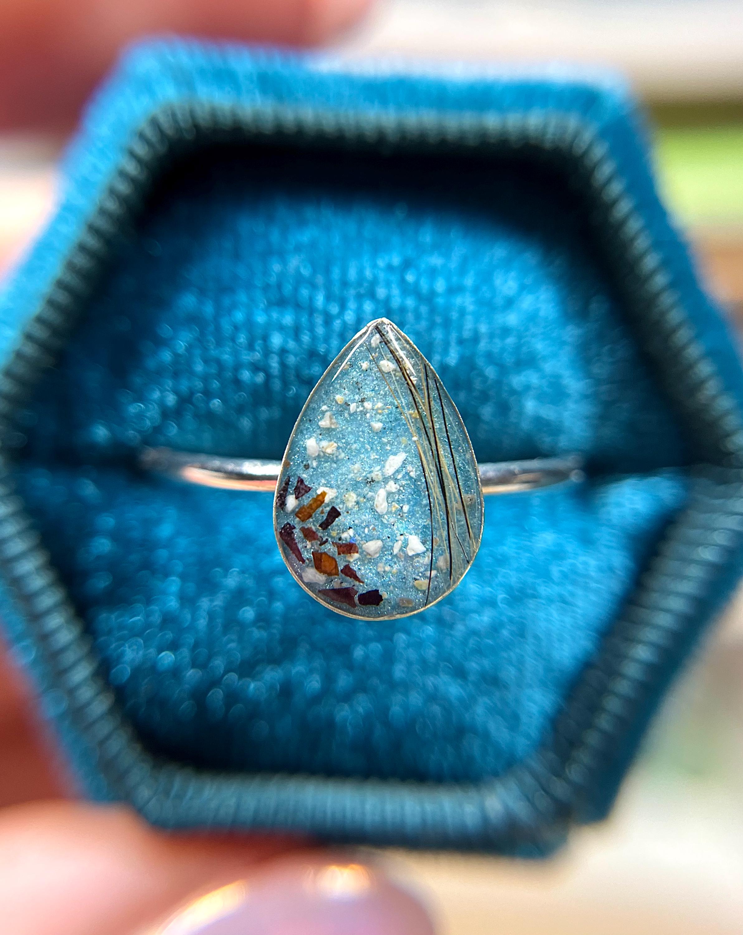 This handmade memorial ring is created using your pets ashes, fur, whiskers or other inclusions. Each piece is thoughtfully crafted with care, shaped slowly and intentionally, and made to be completely one of a kind. No two rings are ever the same — each one reflects the unique story and connection it’s meant to honor.